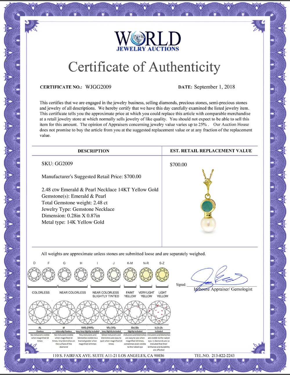 REF-20A4K - SKU: GG2009 ---- Genuine 2.48 ctw Emerald & Pearl Necklace 14KT Yellow Gold