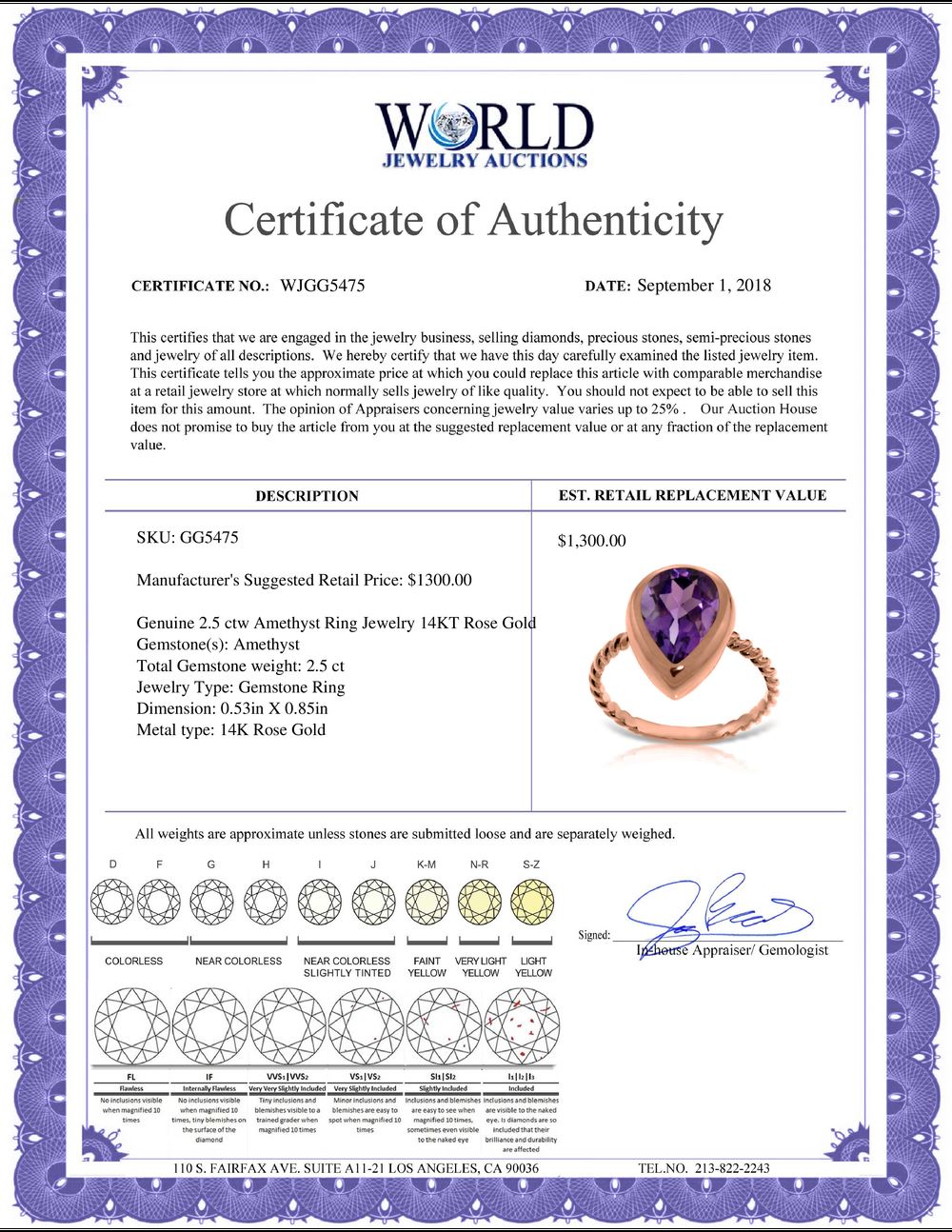 WORLD JEWELRY AUCTION believes to the best of its knowledge that the information presented in any listing has come from reliable sources. Such information is presented solely for the convenience of the Purchaser. WJA makes no warranties of any kind related to the information presented in any listing. WJA further makes no warranties, either express or implied, relating to the value, marketability or condition of the lot described in any listing. Prospective bidders should investigate a lot thoroughly before bidding. By bidding the Bidder acknowledges that Bidder has investigated the lot to his or her satisfaction, or, that Bidder has chosen not to do so, and agrees to accept the lot being bid on with no objections after the sale closes. If you are uncertain please contact us with your questions prior to bidding. If you are still uncertain after we reply, please refrain from bidding. Photos other graphic material contained in any listing of generic or duplicate lots may be stock presentations and not necessarily of the specific lot.