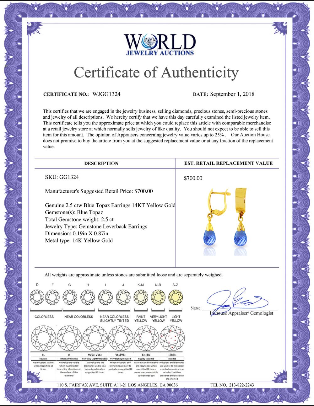 REF-22N3R - SKU: GG1324 ---- Genuine 2.5 ctw Blue Topaz Earrings 14KT Yellow Gold
