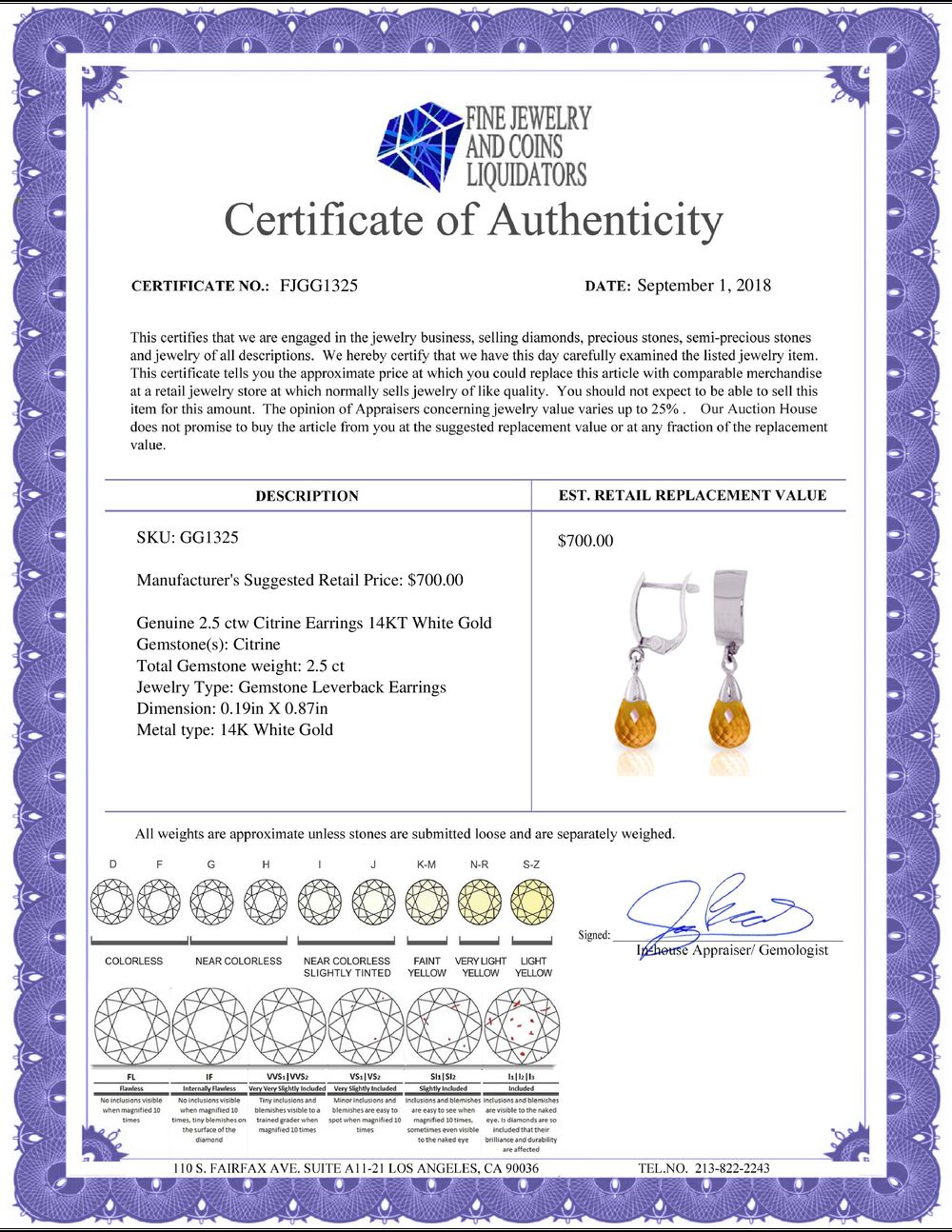 REF-22Y3F - SKU: GG1325 ---- Genuine 2.5 ctw Citrine Earrings 14KT White Gold
