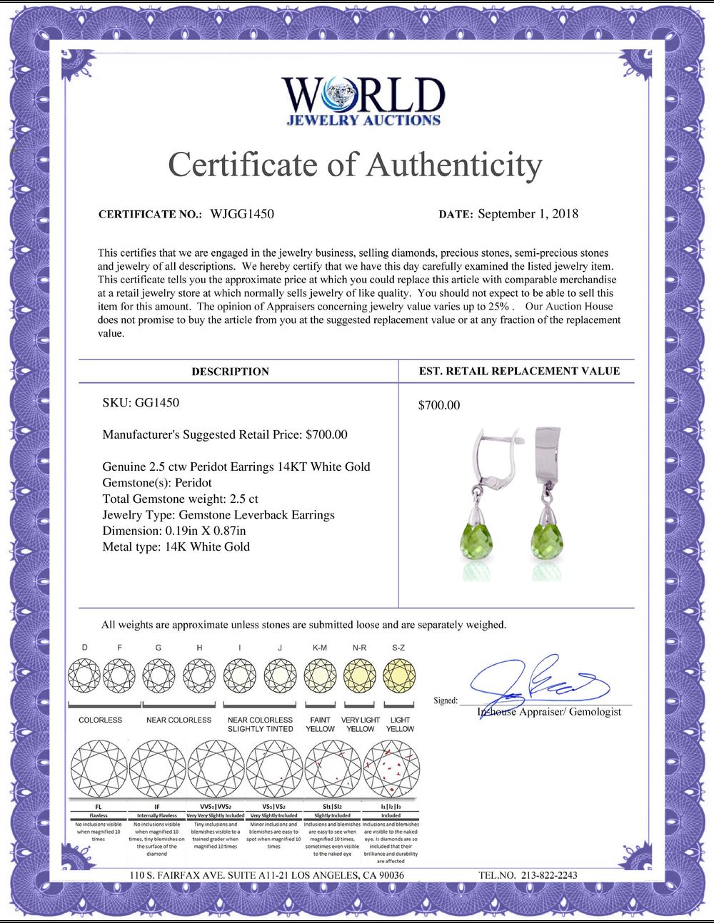 All property is sold “AS IS”, and ALL SALES ARE FINAL. Property is open to thorough public inspection. It is the Bidder’s responsibility to determine condition, age, genuineness, value or any other determinative factor. WJA may attempt to describe the merchandise in advertising and on the Internet but makes no representations. In no event shall WORLD JEWELRY AUCTION be held responsible for having made or implied any warranty of merchantability or fitness for a particular purpose. Bidder shall be the sole judge of value.