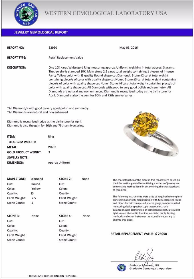 total approx. 3 grams. The Jewelry is stamped 10K, Main stone 2.5 carat total weight containing 1 piece/s of Intense Fancy Yellow color with
