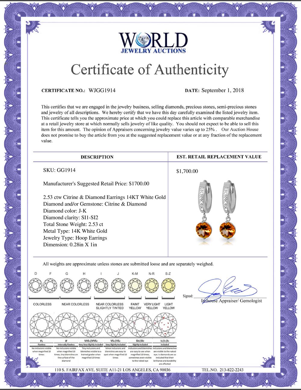 All property is sold “AS IS”, and ALL SALES ARE FINAL. Property is open to thorough public inspection. It is the Bidder’s responsibility to determine condition, age, genuineness, value or any other determinative factor. WJA may attempt to describe the merchandise in advertising and on the Internet but makes no representations. In no event shall WORLD JEWELRY AUCTION be held responsible for having made or implied any warranty of merchantability or fitness for a particular purpose. Bidder shall be the sole judge of value.