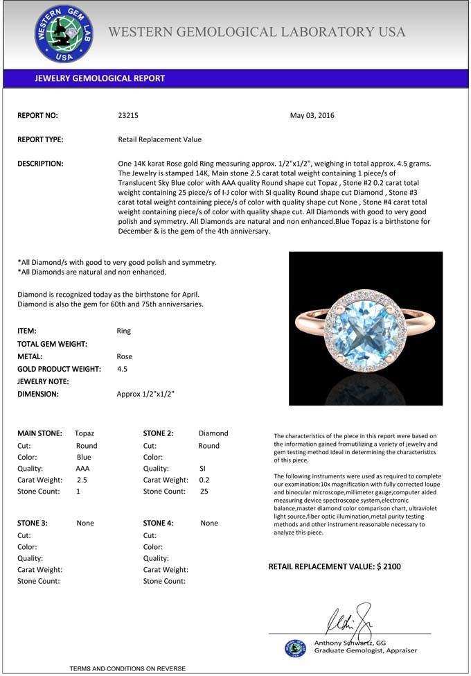 total approx. 4.5 grams. The Jewelry is stamped 14K, Main stone 2.5 carat total weight containing 1 piece/s of Translucent Sky Blue color with
