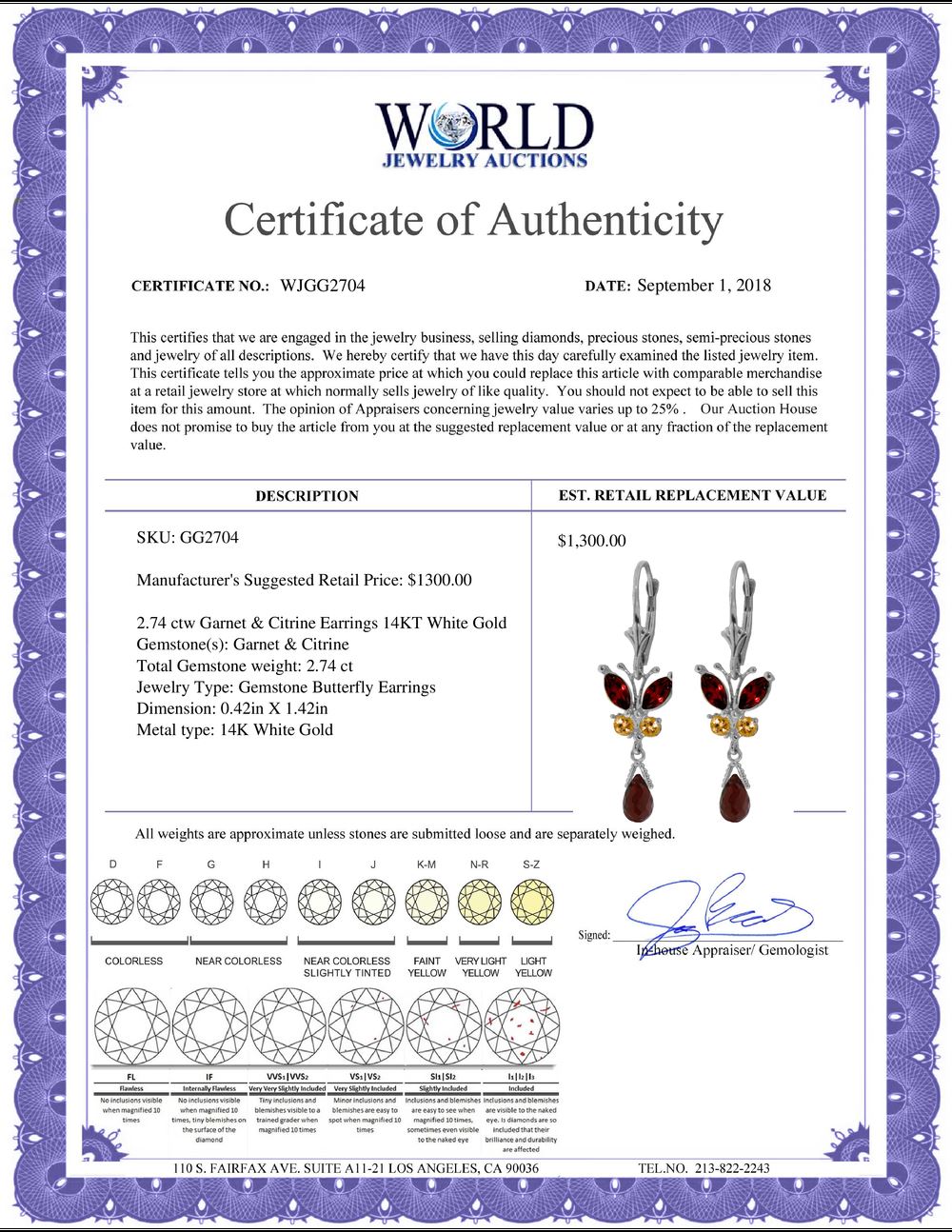 REF-42F6Z - SKU: GG2704 ---- Genuine 2.74 ctw Garnet & Citrine Earrings 14KT White Gold