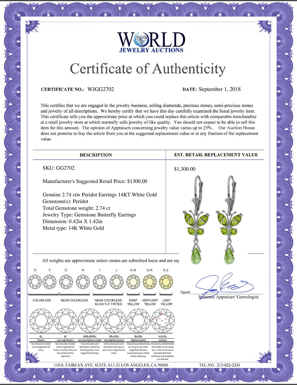 REF-42M6T - SKU: GG2702 ---- Genuine 2.74 ctw Peridot Earrings 14KT White Gold