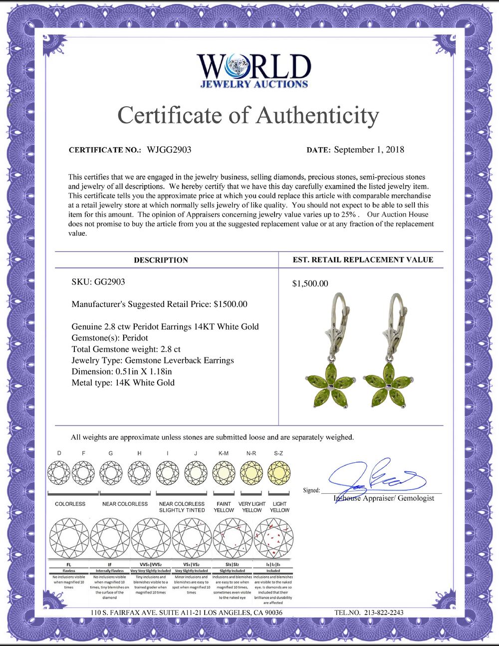 REF-46K7V - SKU: GG2903 ---- Genuine 2.8 ctw Peridot Earrings 14KT White Gold