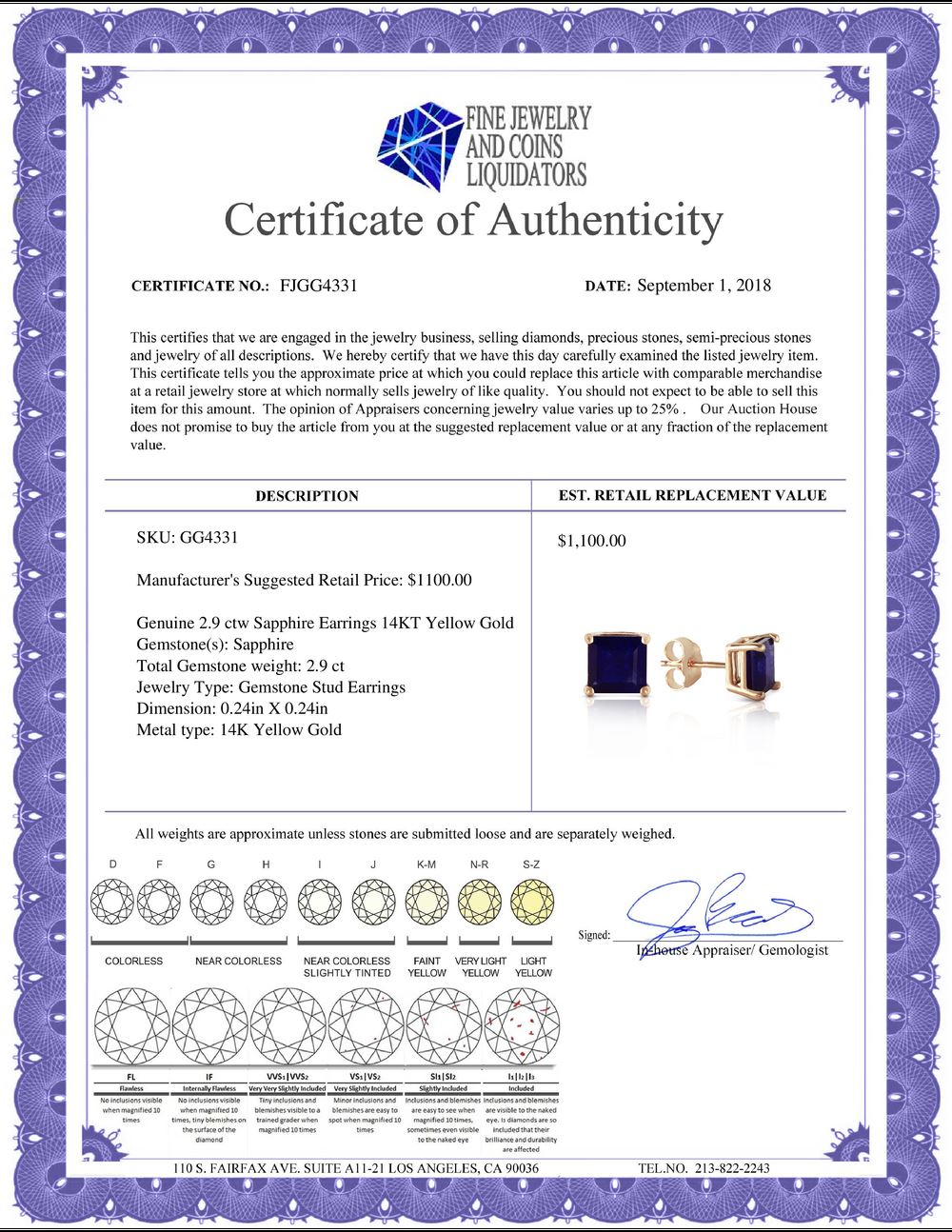 REF-36V3W - SKU: GG4331 ---- Genuine 2.9 ctw Sapphire Earrings 14KT Yellow Gold