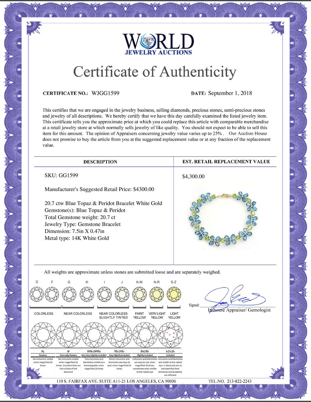 REF-142W9Y - SKU: GG1599 ---- Genuine 20.7 ctw Blue Topaz & Peridot Bracelet 14KT White Gold