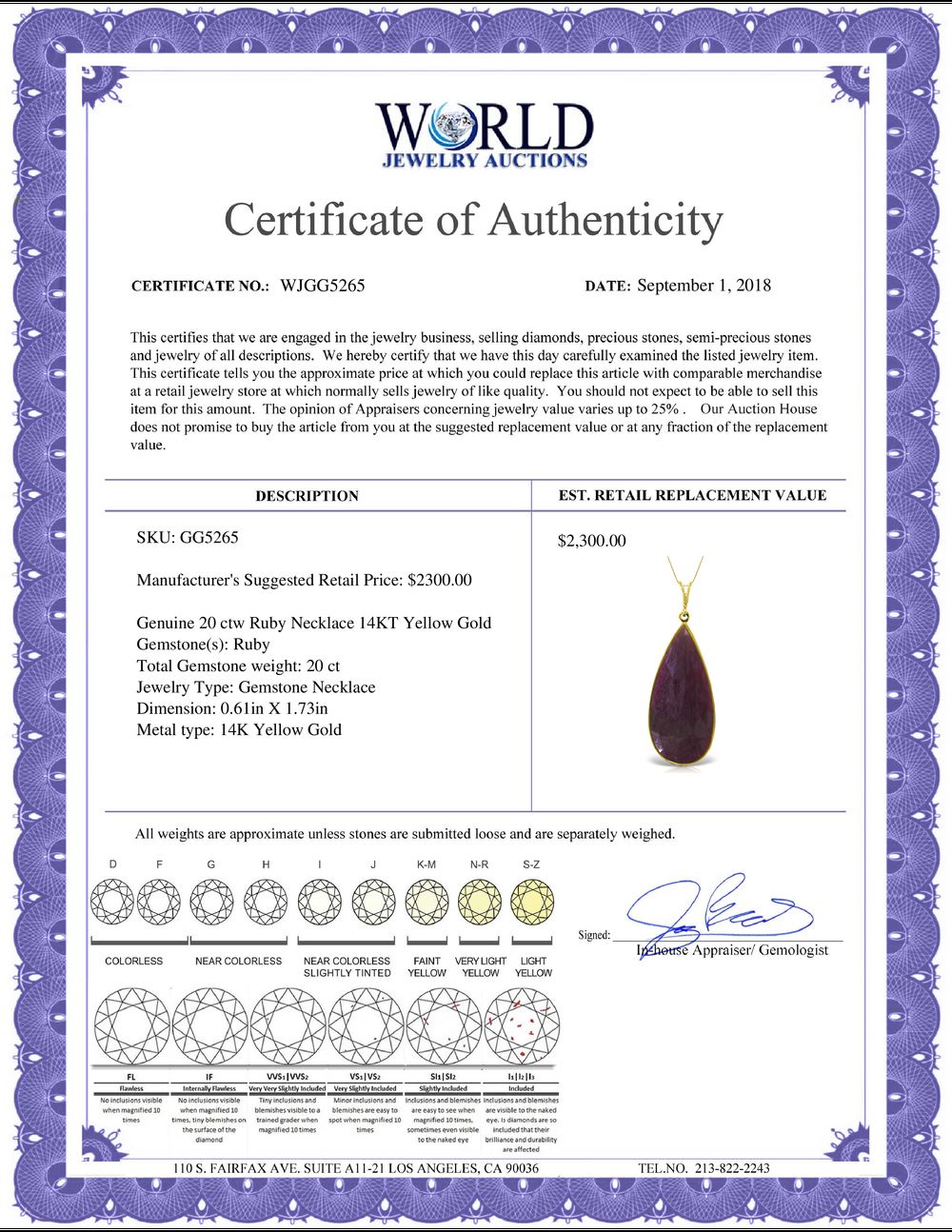 All property is sold “AS IS”, and ALL SALES ARE FINAL. Property is open to thorough public inspection. It is the Bidder’s responsibility to determine condition, age, genuineness, value or any other determinative factor. WJA may attempt to describe the merchandise in advertising and on the Internet but makes no representations. In no event shall WORLD JEWELRY AUCTION be held responsible for having made or implied any warranty of merchantability or fitness for a particular purpose. Bidder shall be the sole judge of value.