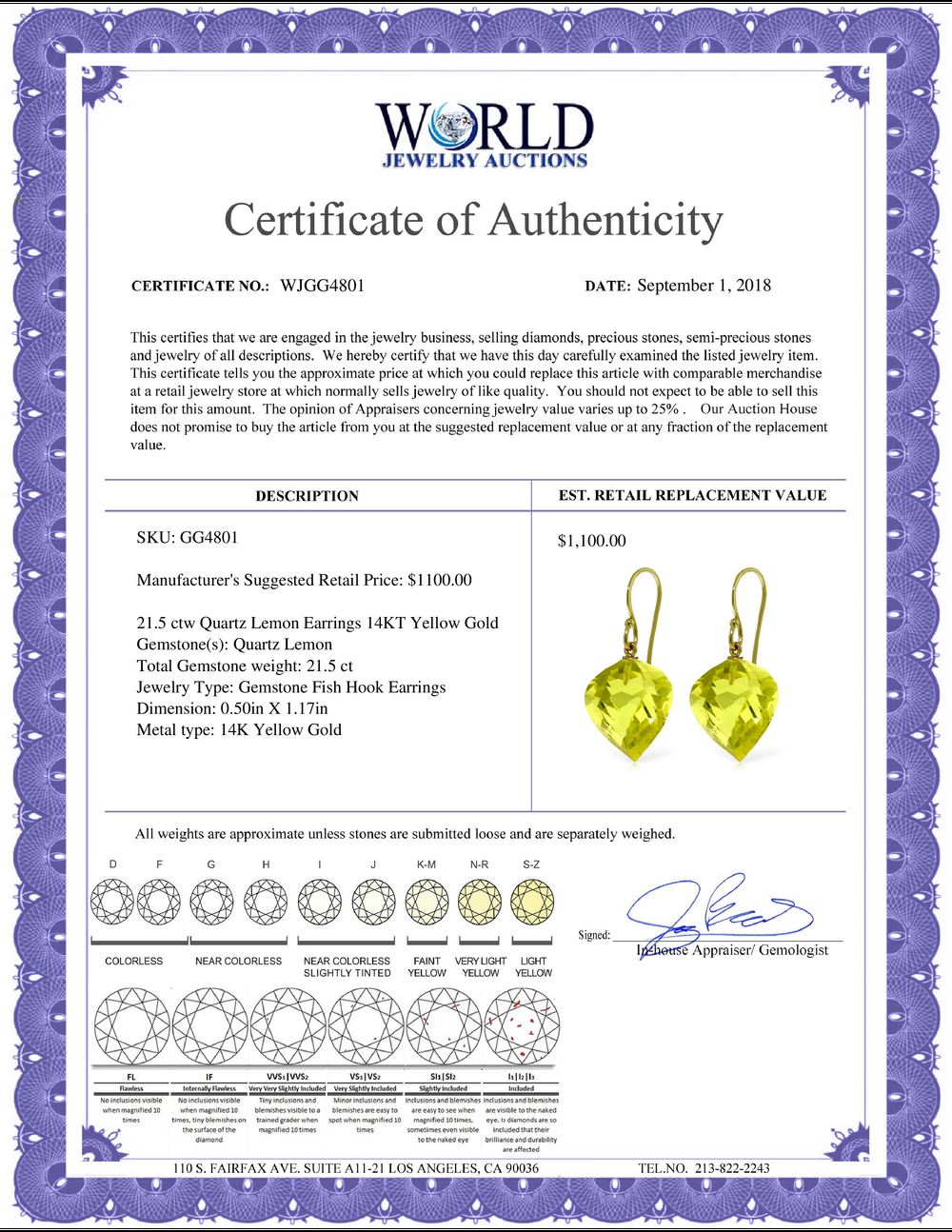 All property is sold “AS IS”, and ALL SALES ARE FINAL. Property is open to thorough public inspection. It is the Bidder’s responsibility to determine condition, age, genuineness, value or any other determinative factor. WJA may attempt to describe the merchandise in advertising and on the Internet but makes no representations. In no event shall WORLD JEWELRY AUCTION be held responsible for having made or implied any warranty of merchantability or fitness for a particular purpose. Bidder shall be the sole judge of value.