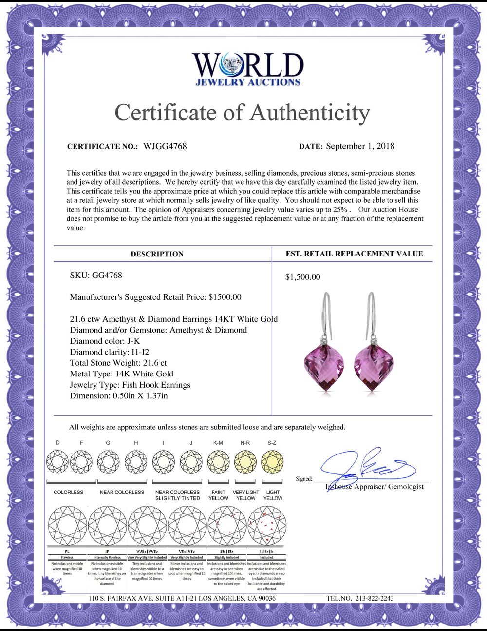 WORLD JEWELRY AUCTION believes to the best of its knowledge that the information presented in any listing has come from reliable sources. Such information is presented solely for the convenience of the Purchaser. WJA makes no warranties of any kind related to the information presented in any listing. WJA further makes no warranties, either express or implied, relating to the value, marketability or condition of the lot described in any listing. Prospective bidders should investigate a lot thoroughly before bidding. By bidding the Bidder acknowledges that Bidder has investigated the lot to his or her satisfaction, or, that Bidder has chosen not to do so, and agrees to accept the lot being bid on with no objections after the sale closes. If you are uncertain please contact us with your questions prior to bidding. If you are still uncertain after we reply, please refrain from bidding. Photos other graphic material contained in any listing of generic or duplicate lots may be stock presentations and not necessarily of the specific lot.