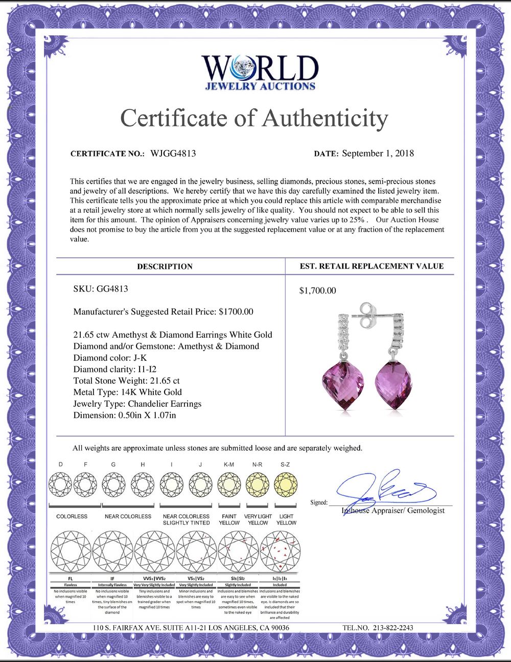 All property is sold “AS IS”, and ALL SALES ARE FINAL. Property is open to thorough public inspection. It is the Bidder’s responsibility to determine condition, age, genuineness, value or any other determinative factor. WJA may attempt to describe the merchandise in advertising and on the Internet but makes no representations. In no event shall WORLD JEWELRY AUCTION be held responsible for having made or implied any warranty of merchantability or fitness for a particular purpose. Bidder shall be the sole judge of value.