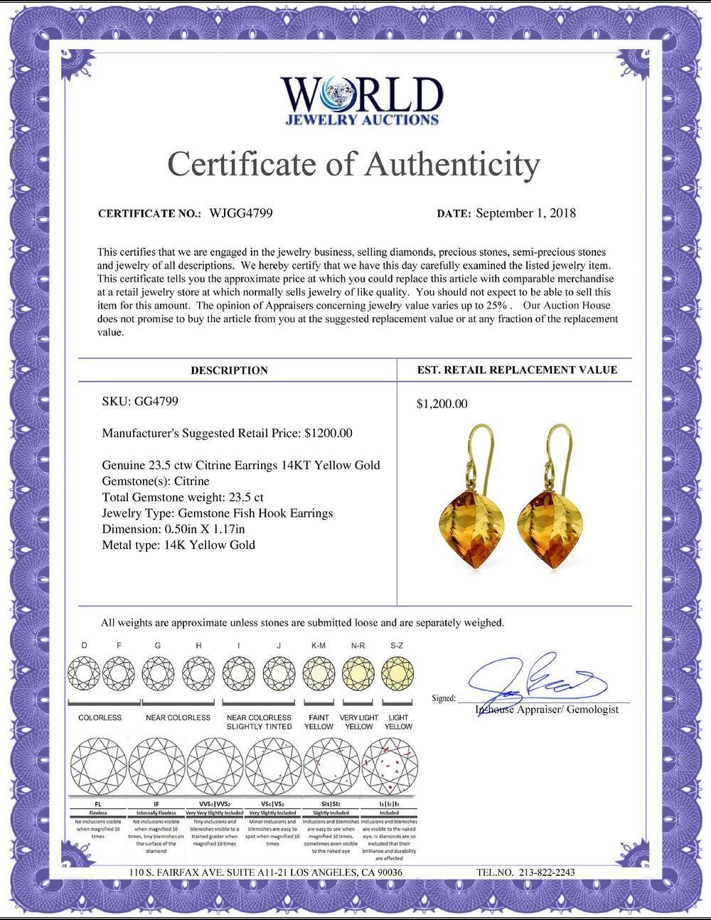 All property is sold “AS IS”, and ALL SALES ARE FINAL. Property is open to thorough public inspection. It is the Bidder’s responsibility to determine condition, age, genuineness, value or any other determinative factor. WJA may attempt to describe the merchandise in advertising and on the Internet but makes no representations. In no event shall WORLD JEWELRY AUCTION be held responsible for having made or implied any warranty of merchantability or fitness for a particular purpose. Bidder shall be the sole judge of value.
