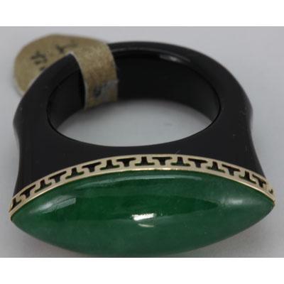 Gemstone: 23X10MM Green Jade ; Gemstone Color: Green & Black ; Gemstone Count: 1 Long Cushion ; Dimension: 23X10MM ; Metal Purity: 14KT ; Metal: Gold-Yellow ; Ring Size: 7