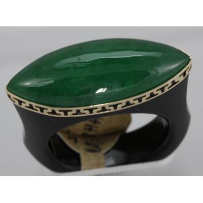 Gemstone: 23X10MM Green Jade ; Gemstone Color: Green & Black ; Gemstone Count: 1 Long Cushion ; Dimension: 23X10MM ; Metal Purity: 14KT ; Metal: Gold-Yellow ; Ring Size: 7