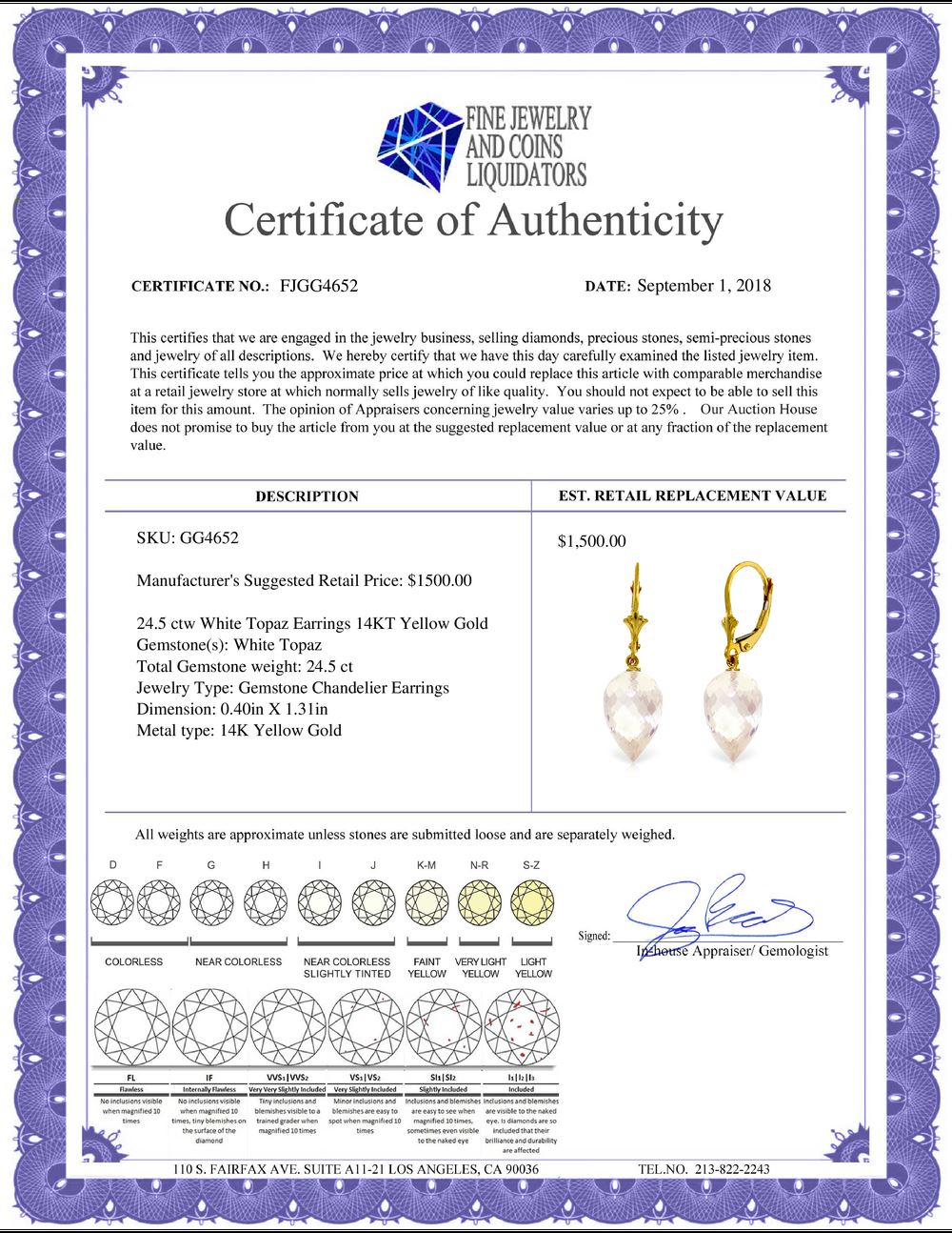 REF-48N3R - SKU: GG4652 ---- Genuine 24.5 ctw White Topaz Earrings 14KT Yellow Gold
