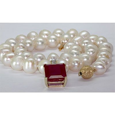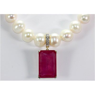 Genuine 29.77 Ruby & Diamond Necklace Freshwater Pearl **|**|** Mainstone: Ruby ; Metal Purity: 14kt ; Metal: Yellow ; Total CTW: 29.77 ctw ; Dimension: 11-12mm ; Diamond Count 1: 5 ; Diamond CTW 1: 0.05 ; SI1-SI2 ; Diamond Color: G-H ; Gemstone Count 1: 1 EMERALD CUT ; Gemstone Weight: 29.72 ; Gemsonte Color: BloI; Availability: 3-10 Business days, ready to ship, with certification of appraisal will take 2 weeks. ; MSRP: $4100