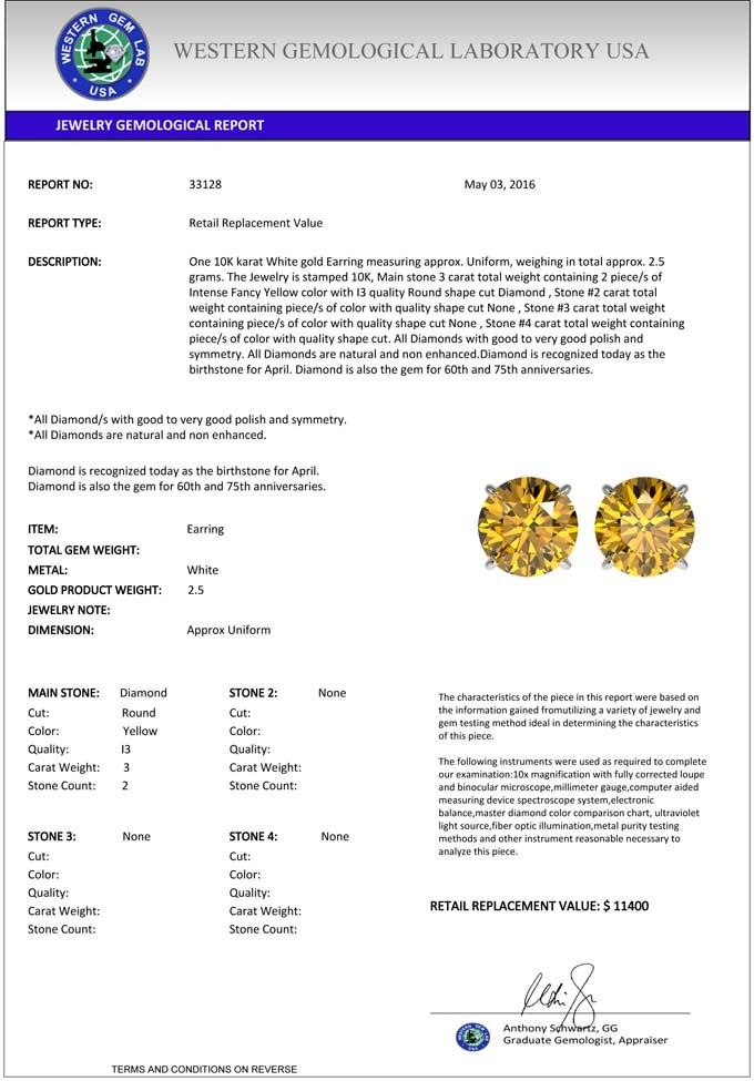 total approx. 2.5 grams. The Jewelry is stamped 10K, Main stone 3 carat total weight containing 2 piece/s of Intense Fancy Yellow color with