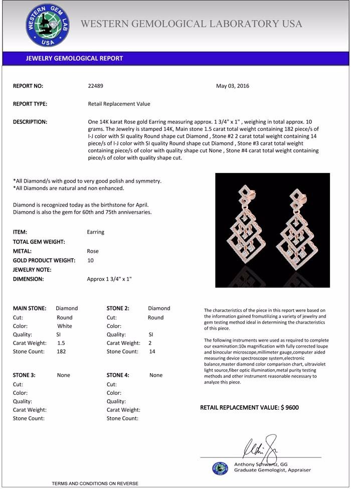 total approx. 10 grams. The Jewelry is stamped 14K, Main stone 1.5 carat total weight containing 182 piece/s of I-J color with
