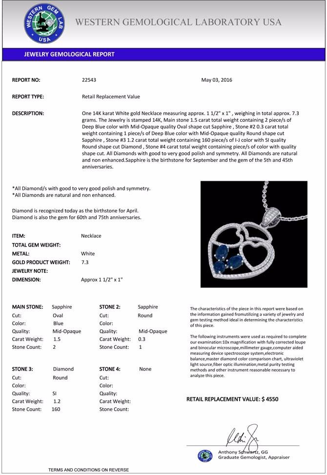 total approx. 7.3 grams. The Jewelry is stamped 14K, Main stone 1.5 carat total weight containing 2 piece/s of Deep Blue color with