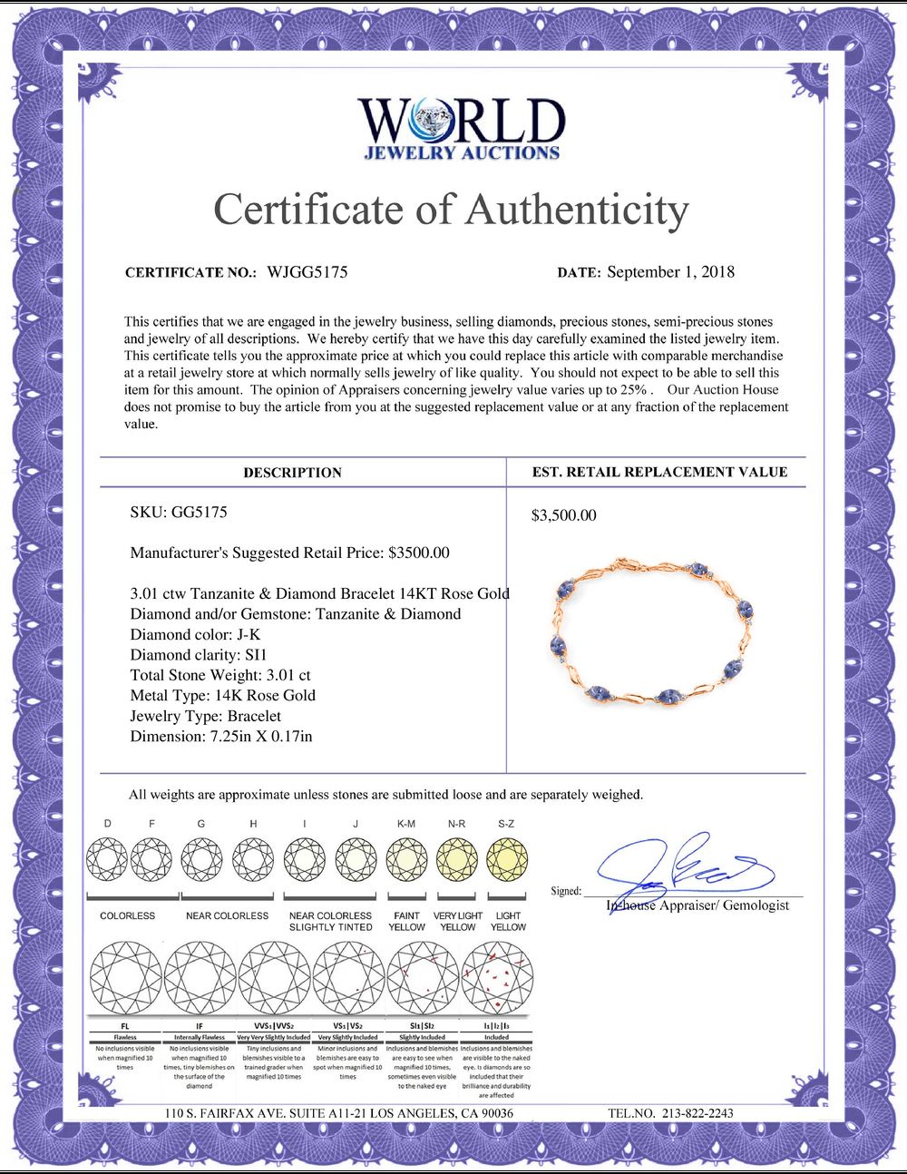SKU: GG5175 ---- Genuine 3.01 ctw Tanzanite & Diamond Bracelet 14KT Rose Gold
