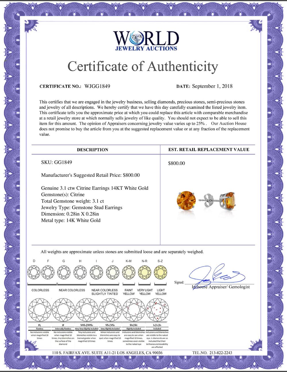 All property is sold “AS IS”, and ALL SALES ARE FINAL. Property is open to thorough public inspection. It is the Bidder’s responsibility to determine condition, age, genuineness, value or any other determinative factor. WJA may attempt to describe the merchandise in advertising and on the Internet but makes no representations. In no event shall WORLD JEWELRY AUCTION be held responsible for having made or implied any warranty of merchantability or fitness for a particular purpose. Bidder shall be the sole judge of value.