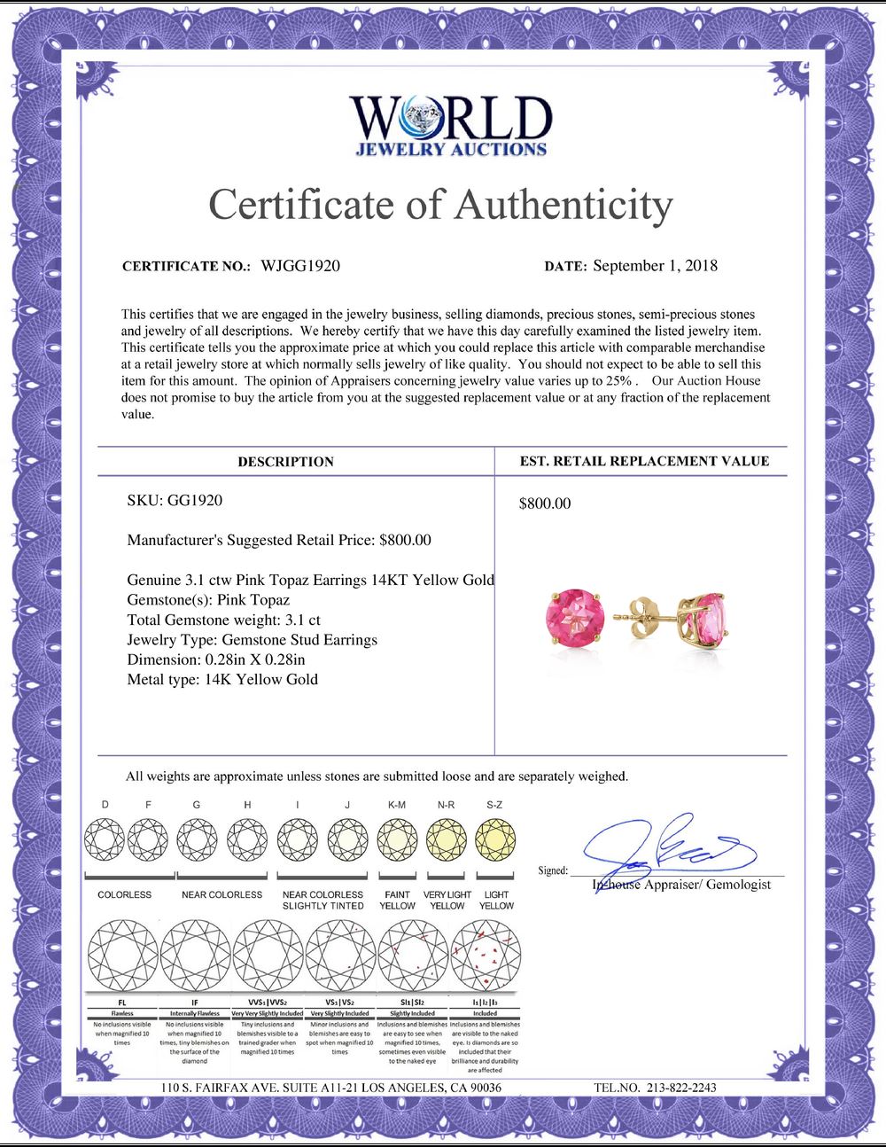 All property is sold “AS IS”, and ALL SALES ARE FINAL. Property is open to thorough public inspection. It is the Bidder’s responsibility to determine condition, age, genuineness, value or any other determinative factor. WJA may attempt to describe the merchandise in advertising and on the Internet but makes no representations. In no event shall WORLD JEWELRY AUCTION be held responsible for having made or implied any warranty of merchantability or fitness for a particular purpose. Bidder shall be the sole judge of value.