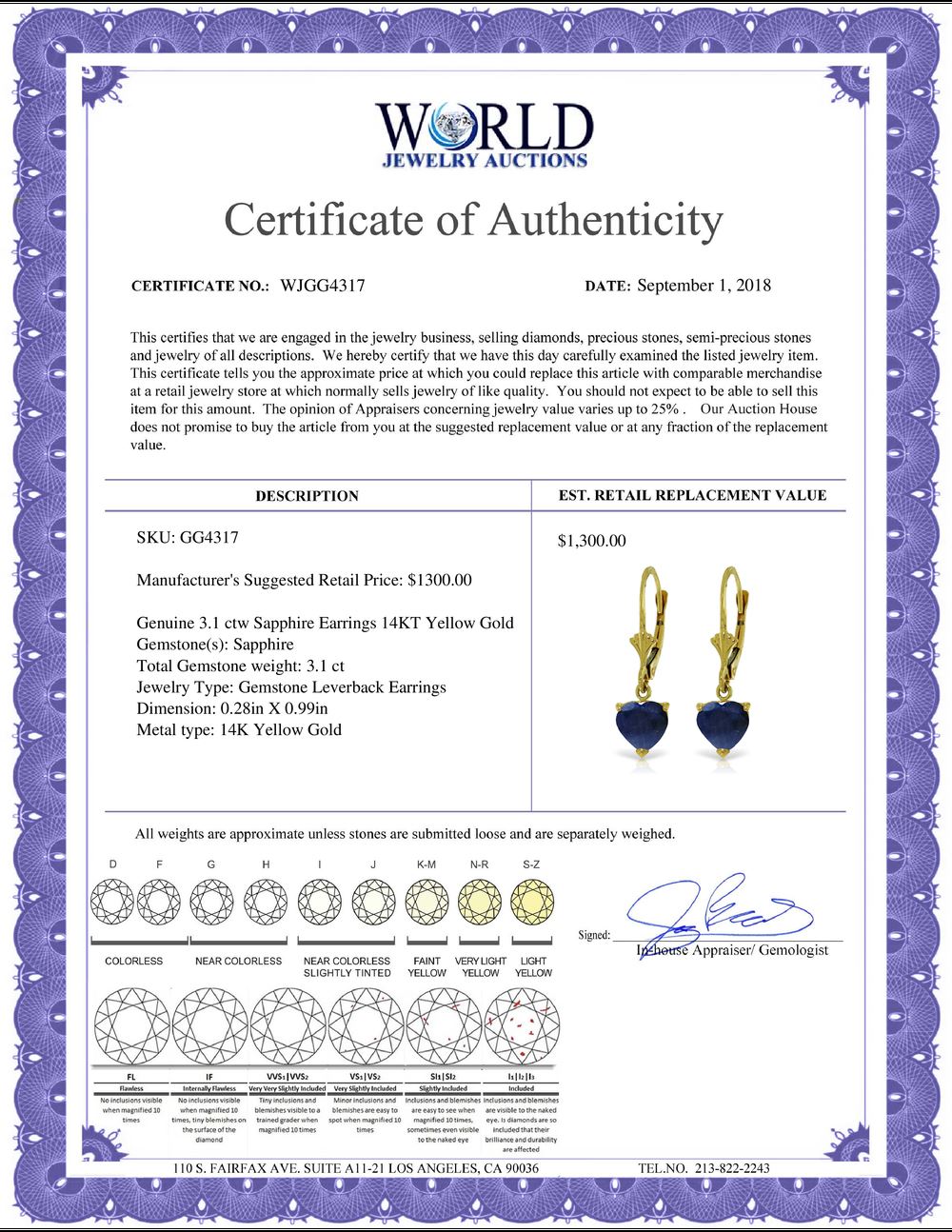 WORLD JEWELRY AUCTION believes to the best of its knowledge that the information presented in any listing has come from reliable sources. Such information is presented solely for the convenience of the Purchaser. WJA makes no warranties of any kind related to the information presented in any listing. WJA further makes no warranties, either express or implied, relating to the value, marketability or condition of the lot described in any listing. Prospective bidders should investigate a lot thoroughly before bidding. By bidding the Bidder acknowledges that Bidder has investigated the lot to his or her satisfaction, or, that Bidder has chosen not to do so, and agrees to accept the lot being bid on with no objections after the sale closes. If you are uncertain please contact us with your questions prior to bidding. If you are still uncertain after we reply, please refrain from bidding. Photos other graphic material contained in any listing of generic or duplicate lots may be stock presentations and not necessarily of the specific lot.