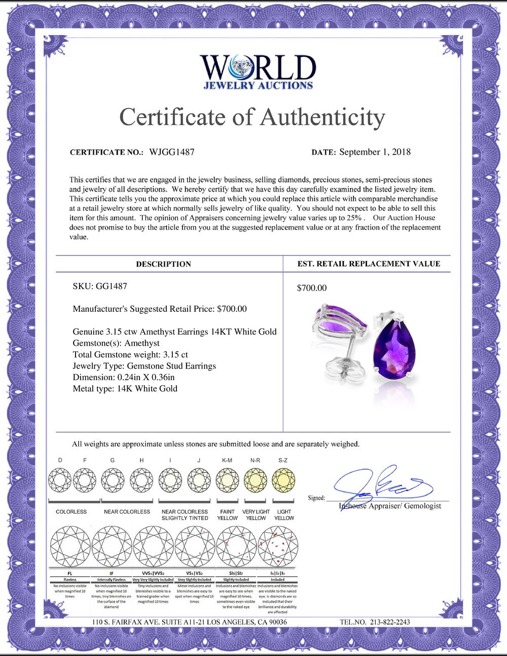 All property is sold “AS IS”, and ALL SALES ARE FINAL. Property is open to thorough public inspection. It is the Bidder’s responsibility to determine condition, age, genuineness, value or any other determinative factor. WJA may attempt to describe the merchandise in advertising and on the Internet but makes no representations. In no event shall WORLD JEWELRY AUCTION be held responsible for having made or implied any warranty of merchantability or fitness for a particular purpose. Bidder shall be the sole judge of value.