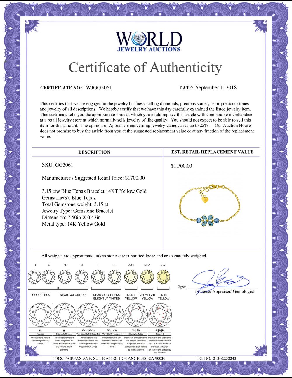 REF-56H4X - SKU: GG5061 ---- Genuine 3.15 ctw Blue Topaz Bracelet 14KT Yellow Gold