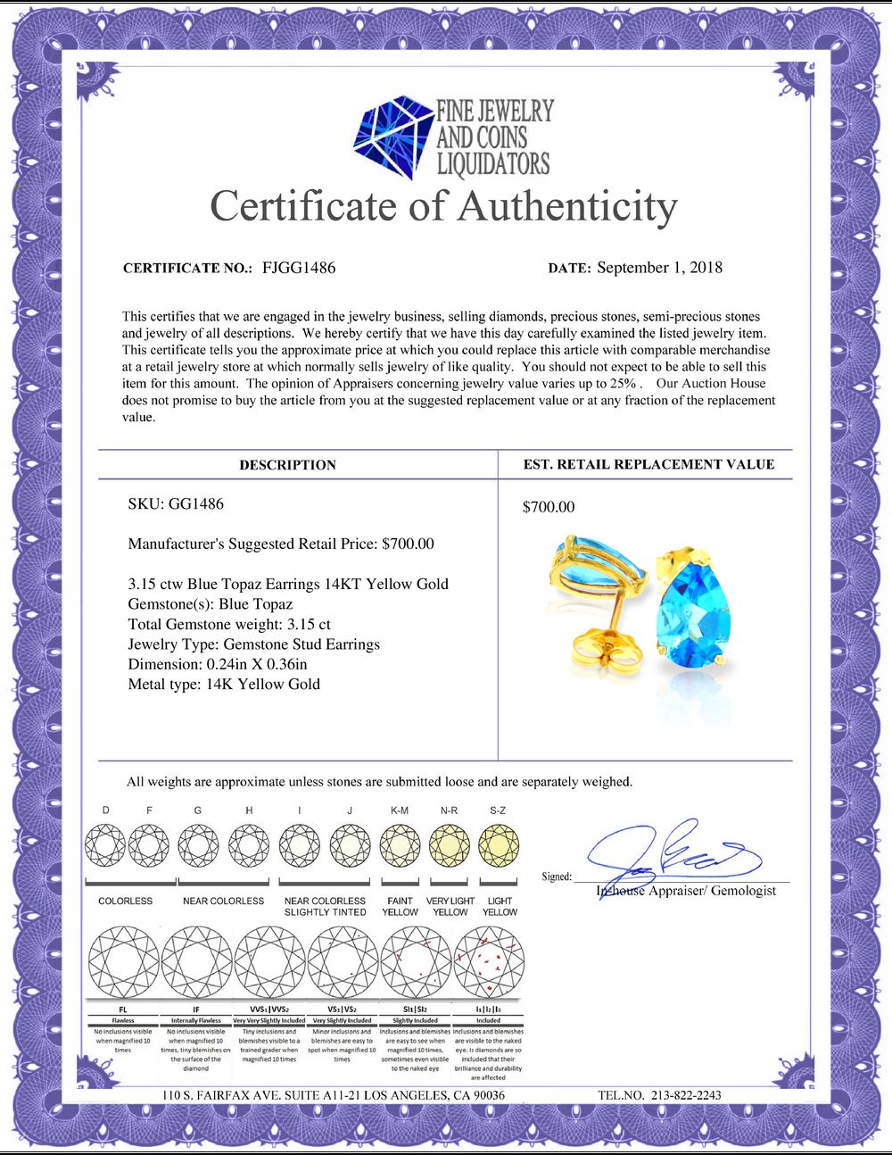 REF-21K2V - SKU: GG1486 ---- Genuine 3.15 ctw Blue Topaz Earrings 14KT Yellow Gold