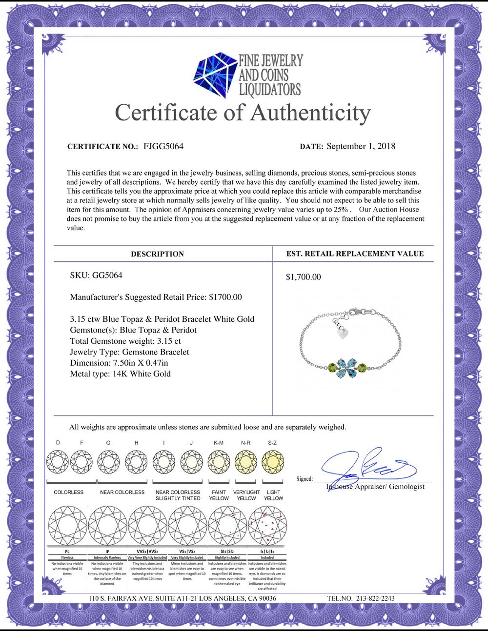 REF-56X4M - SKU: GG5064 ---- Genuine 3.15 ctw Blue Topaz & Peridot Bracelet 14KT Rose Gold