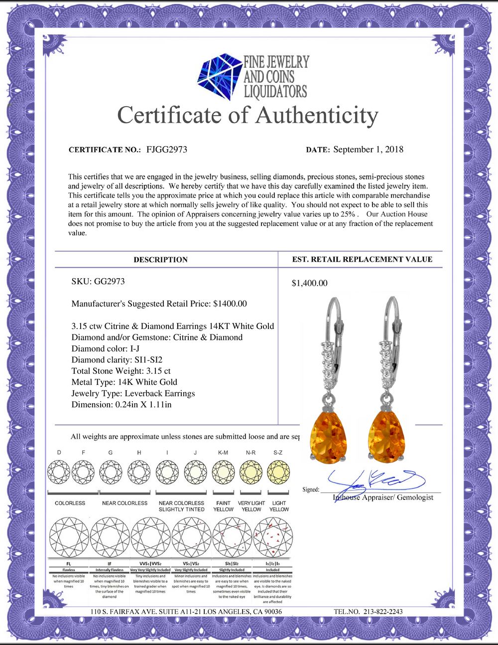 REF-44K3V - SKU: GG2973 ---- Genuine 3.15 ctw Citrine & Diamond Earrings 14KT White Gold