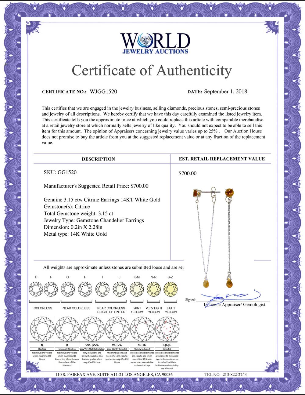 REF-22R3P - SKU: GG1520 ---- Genuine 3.15 ctw Citrine Earrings 14KT White Gold