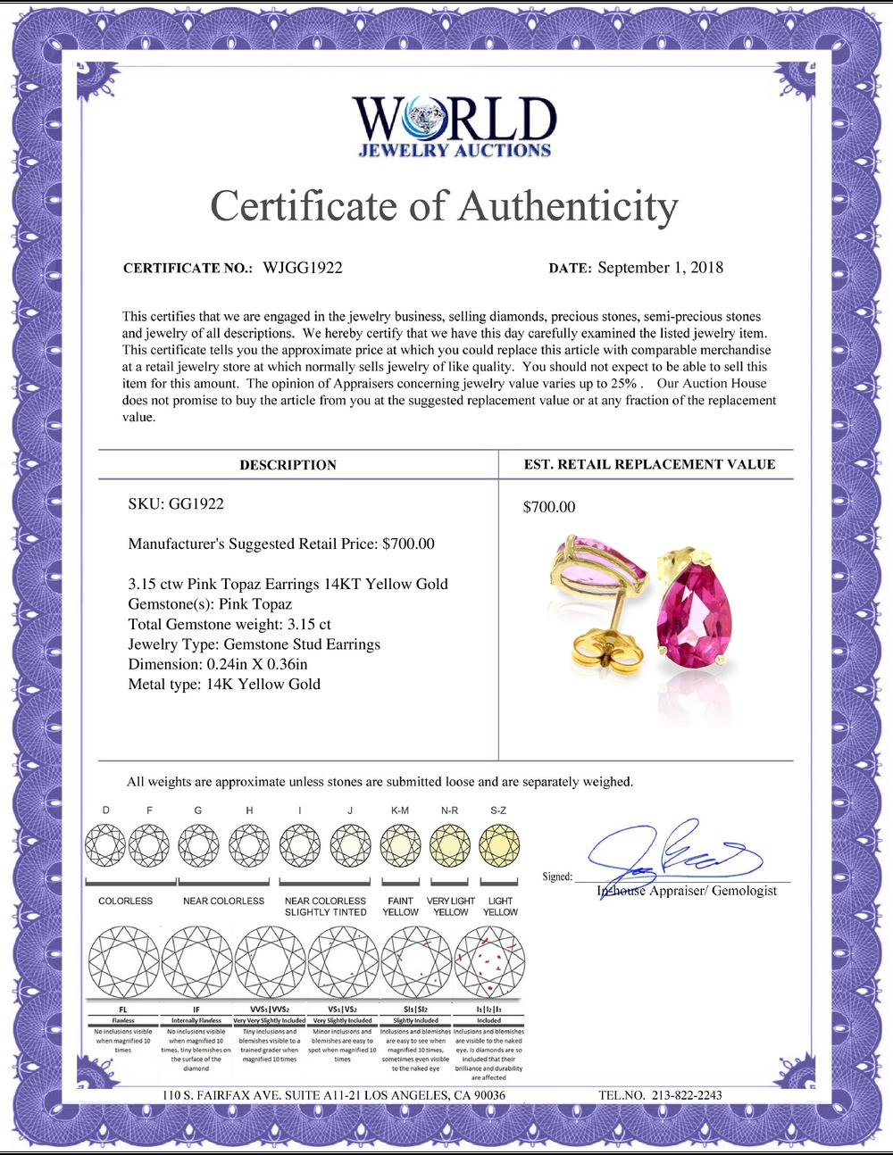 Genuine 14K Yellow Gold 3.15 ctw Pink Topaz Earrings