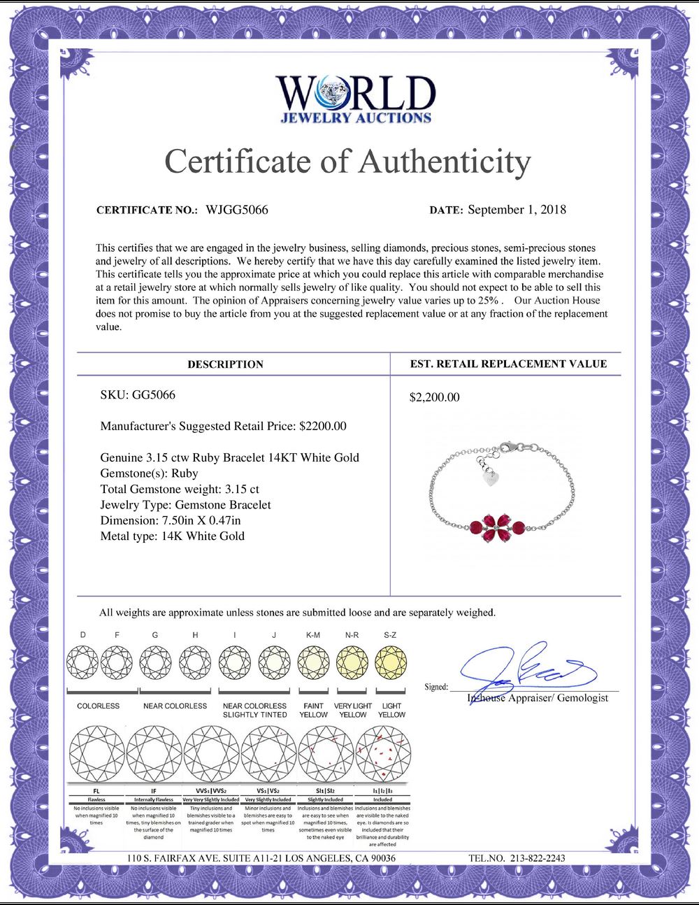 WORLD JEWELRY AUCTION believes to the best of its knowledge that the information presented in any listing has come from reliable sources. Such information is presented solely for the convenience of the Purchaser. WJA makes no warranties of any kind related to the information presented in any listing. WJA further makes no warranties, either express or implied, relating to the value, marketability or condition of the lot described in any listing. Prospective bidders should investigate a lot thoroughly before bidding. By bidding the Bidder acknowledges that Bidder has investigated the lot to his or her satisfaction, or, that Bidder has chosen not to do so, and agrees to accept the lot being bid on with no objections after the sale closes. If you are uncertain please contact us with your questions prior to bidding. If you are still uncertain after we reply, please refrain from bidding. Photos other graphic material contained in any listing of generic or duplicate lots may be stock presentations and not necessarily of the specific lot.