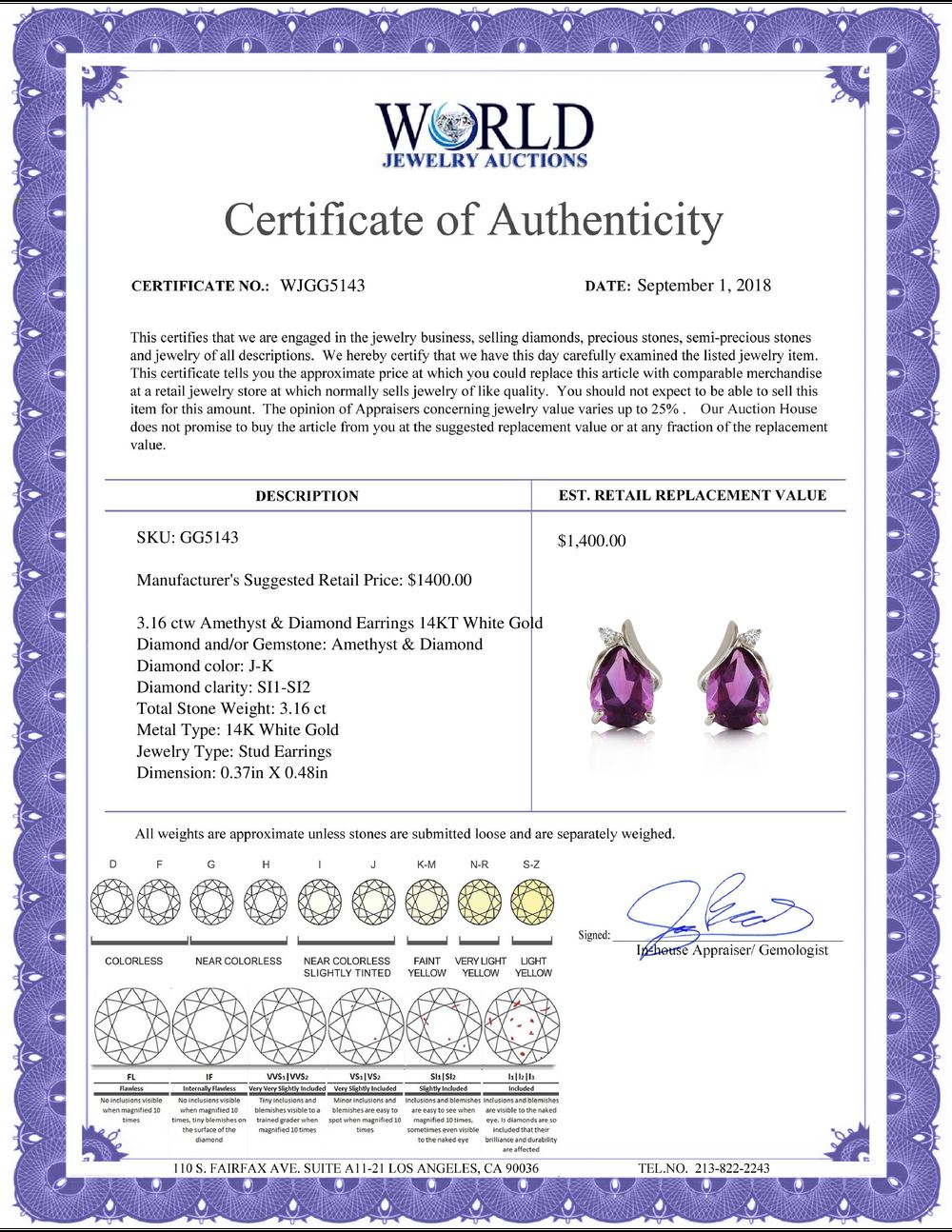 REF-45K2V - SKU: GG5143 ---- Genuine 3.16 ctw Amethyst & Diamond Earrings 14KT White Gold
