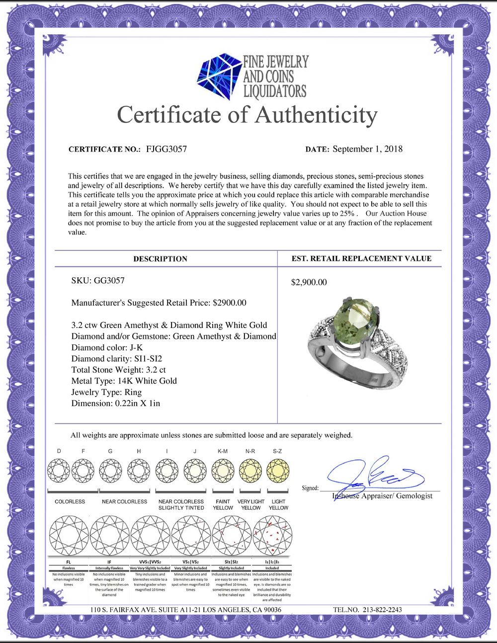 REF-95H7X - SKU: GG3057 ---- Genuine 3.2 ctw Green Amethyst & Diamond Ring 14KT White Gold