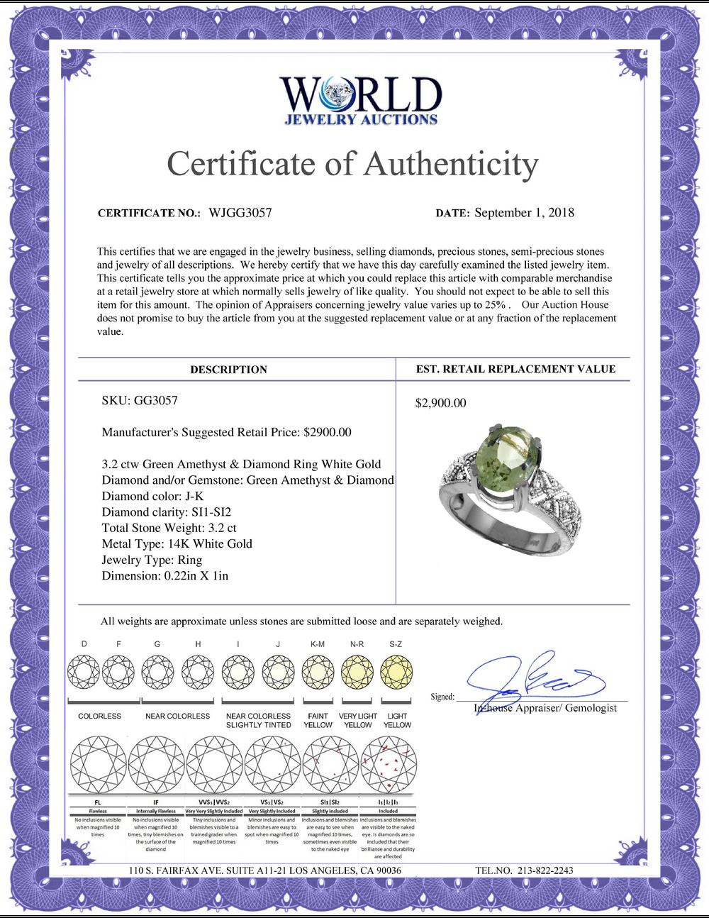 REF-95H7X - SKU: GG3057 ---- Genuine 3.2 ctw Green Amethyst & Diamond Ring 14KT White Gold