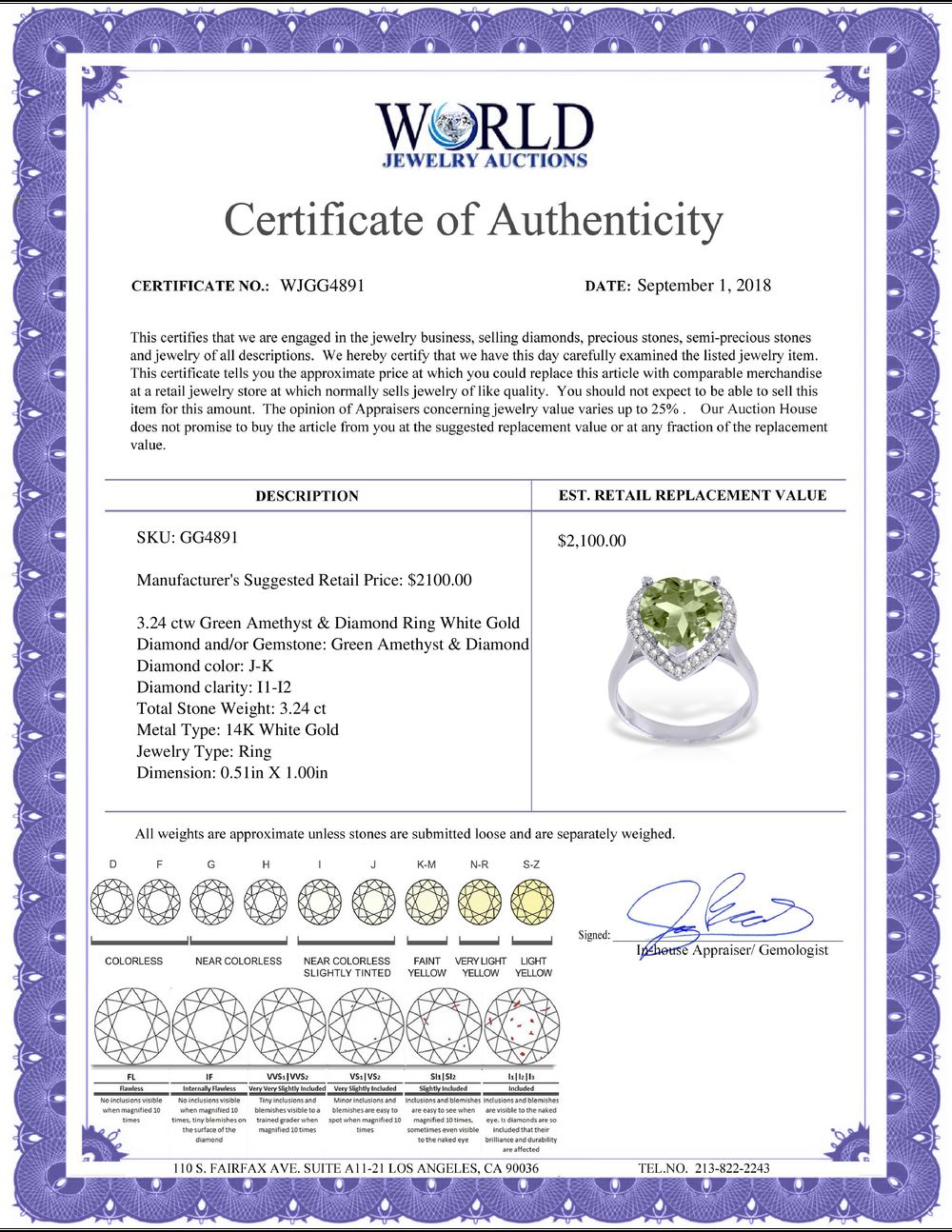 WORLD JEWELRY AUCTION believes to the best of its knowledge that the information presented in any listing has come from reliable sources. Such information is presented solely for the convenience of the Purchaser. WJA makes no warranties of any kind related to the information presented in any listing. WJA further makes no warranties, either express or implied, relating to the value, marketability or condition of the lot described in any listing. Prospective bidders should investigate a lot thoroughly before bidding. By bidding the Bidder acknowledges that Bidder has investigated the lot to his or her satisfaction, or, that Bidder has chosen not to do so, and agrees to accept the lot being bid on with no objections after the sale closes. If you are uncertain please contact us with your questions prior to bidding. If you are still uncertain after we reply, please refrain from bidding. Photos other graphic material contained in any listing of generic or duplicate lots may be stock presentations and not necessarily of the specific lot.