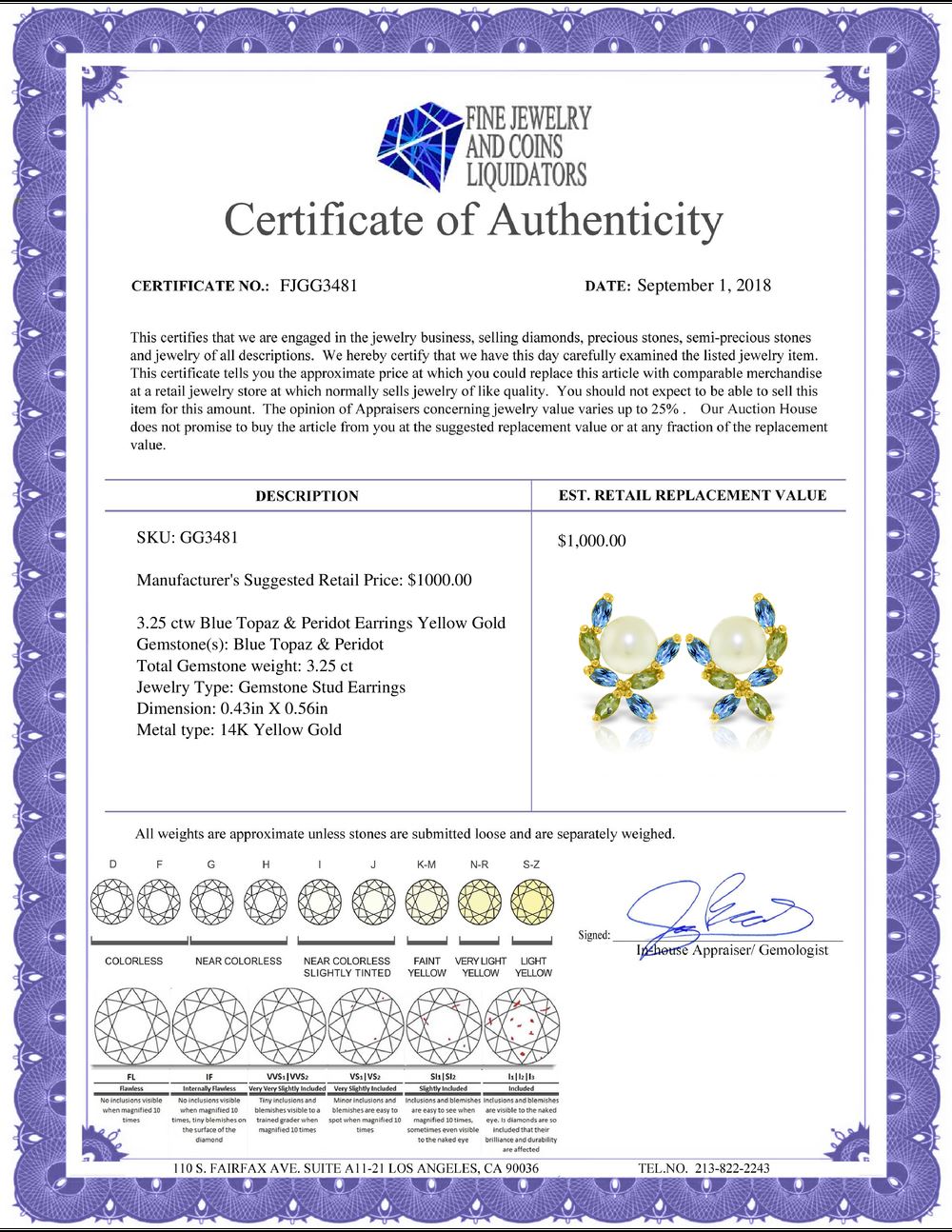 REF-30M2T - SKU: GG3481 ---- Genuine 3.25 ctw Blue Topaz & Peridot Earrings 14KT Yellow Gold
