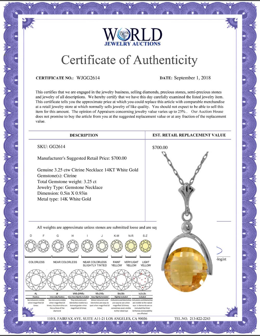 All property is sold “AS IS”, and ALL SALES ARE FINAL. Property is open to thorough public inspection. It is the Bidder’s responsibility to determine condition, age, genuineness, value or any other determinative factor. WJA may attempt to describe the merchandise in advertising and on the Internet but makes no representations. In no event shall WORLD JEWELRY AUCTION be held responsible for having made or implied any warranty of merchantability or fitness for a particular purpose. Bidder shall be the sole judge of value.
