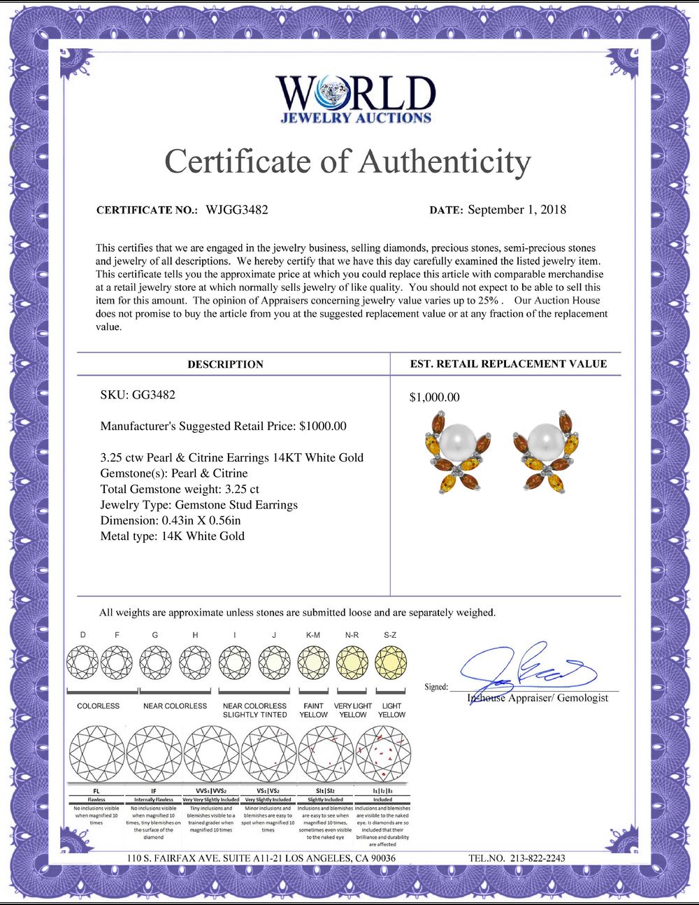 REF-30P2H - SKU: GG3482 ---- Genuine 3.25 ctw Pearl & Citrine Earrings 14KT White Gold