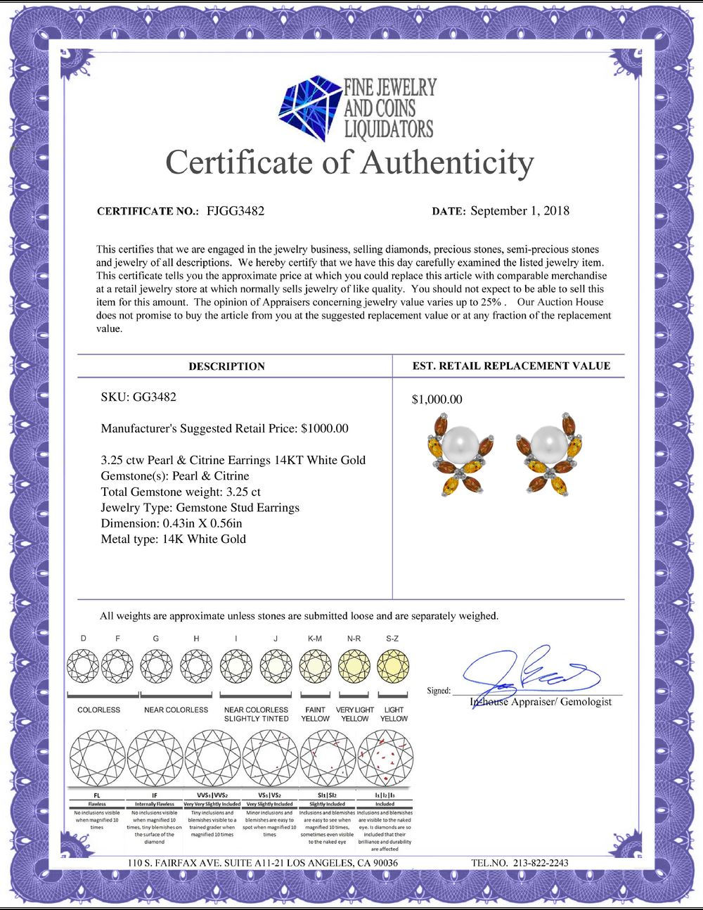 REF-30P2H - SKU: GG3482 ---- Genuine 3.25 ctw Pearl & Citrine Earrings 14KT White Gold