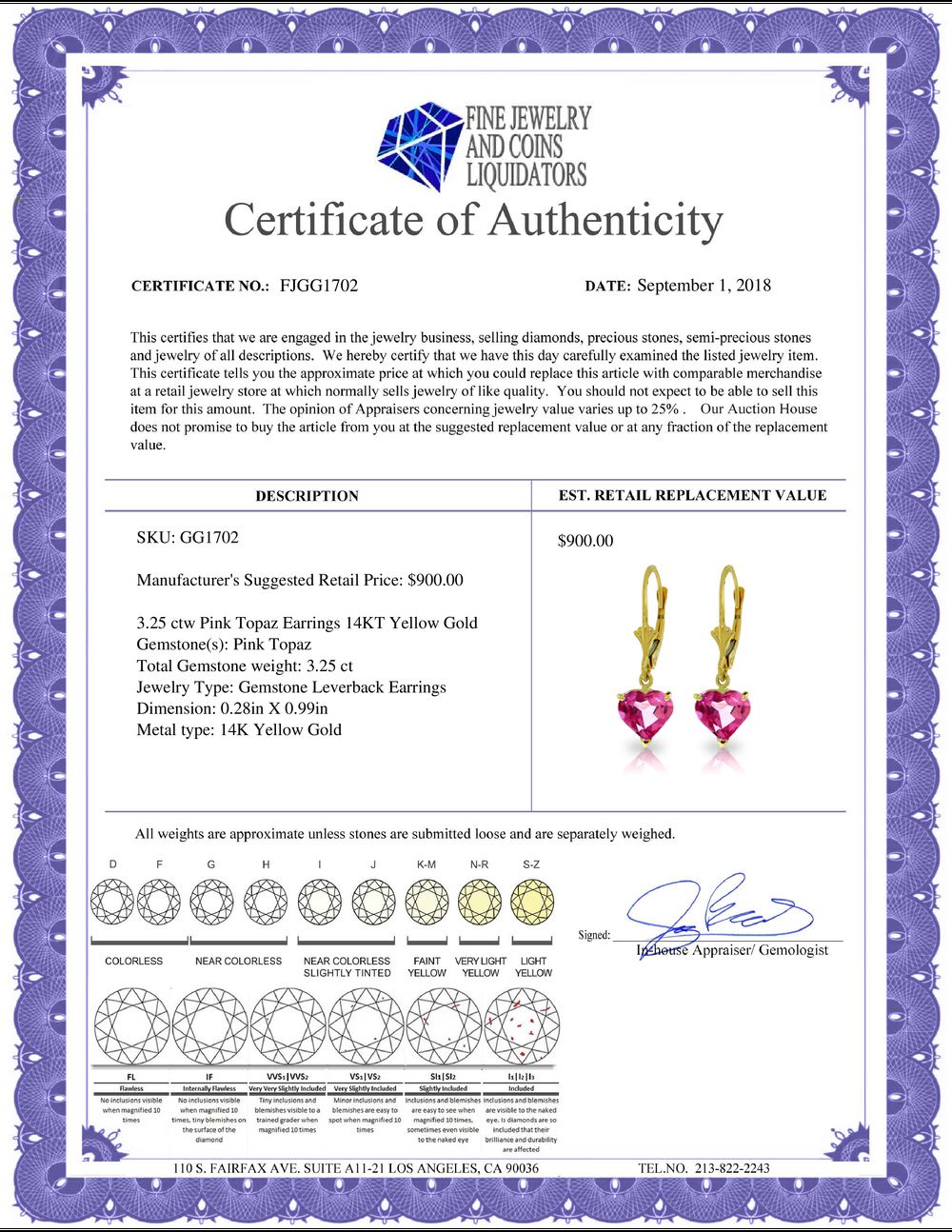 REF-29A2K - SKU: GG1702 ---- Genuine 3.25 ctw Pink Topaz Earrings 14KT Yellow Gold