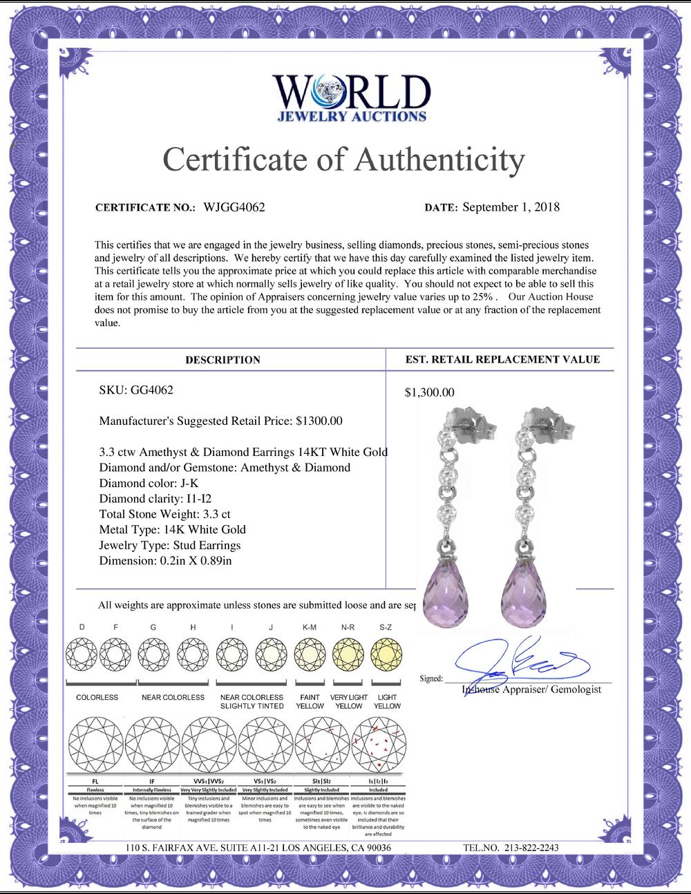 All property is sold “AS IS”, and ALL SALES ARE FINAL. Property is open to thorough public inspection. It is the Bidder’s responsibility to determine condition, age, genuineness, value or any other determinative factor. WJA may attempt to describe the merchandise in advertising and on the Internet but makes no representations. In no event shall WORLD JEWELRY AUCTION be held responsible for having made or implied any warranty of merchantability or fitness for a particular purpose. Bidder shall be the sole judge of value.