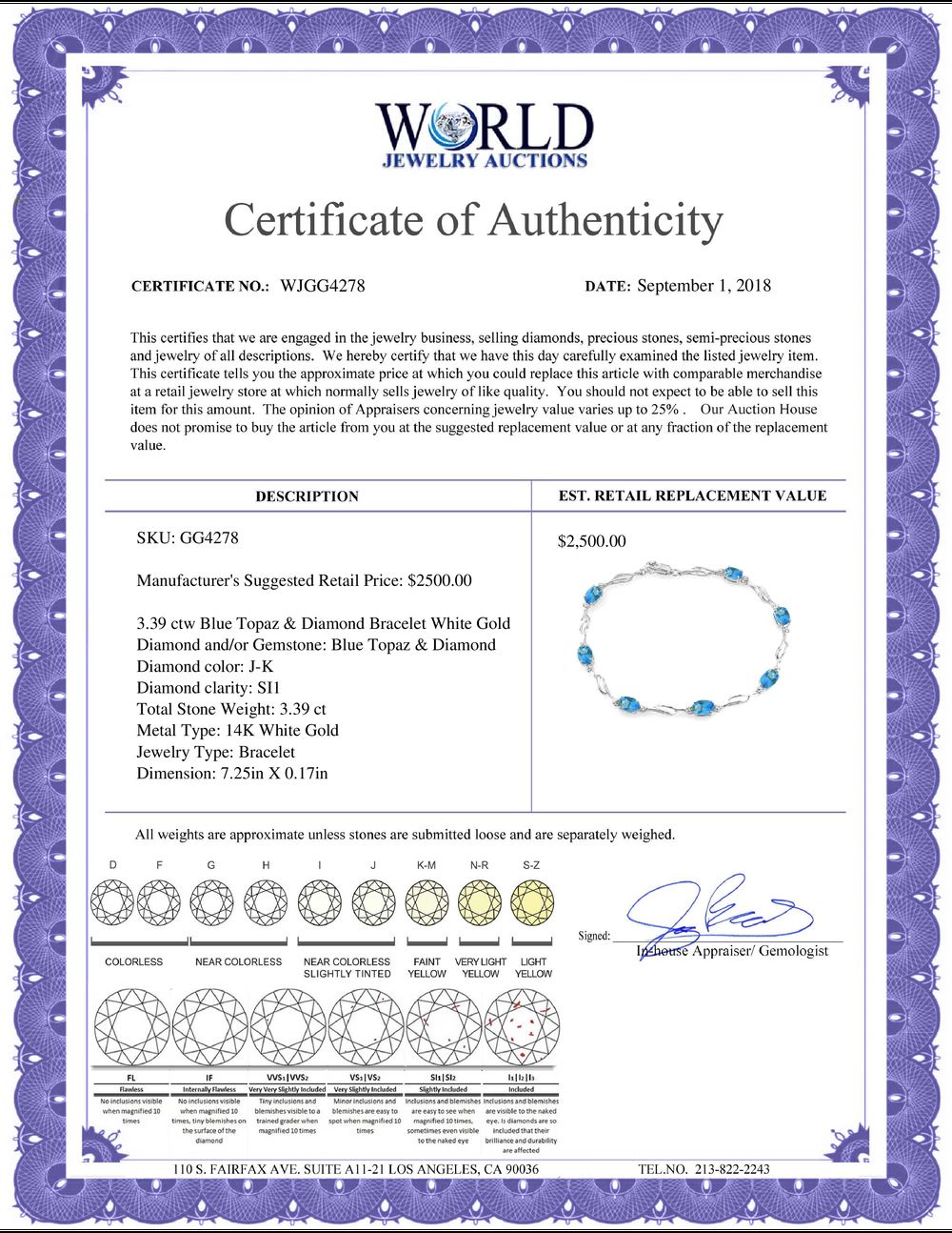 REF-82M5T - SKU: GG4278 ---- Genuine 3.39 ctw Blue Topaz & Diamond Bracelet 14KT Rose Gold