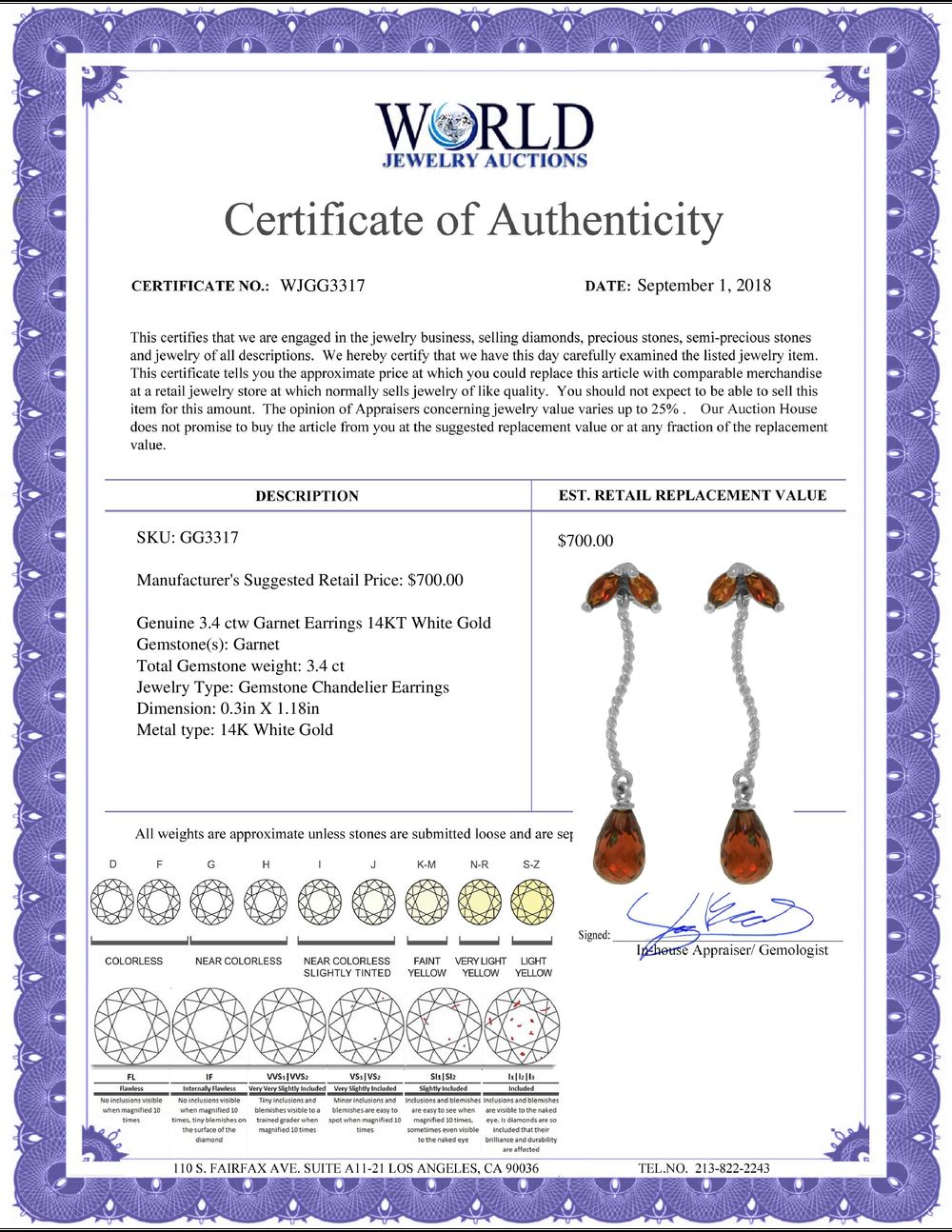 REF-21H6X - SKU: GG3317 ---- Genuine 3.4 ctw Garnet Earrings 14KT White Gold