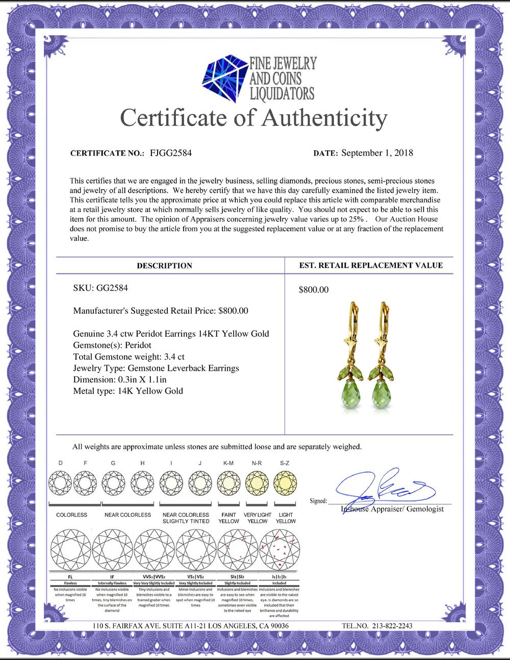 Genuine 14K Yellow Gold 3.4 ctw Peridot Earrings